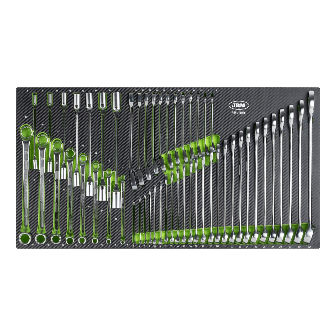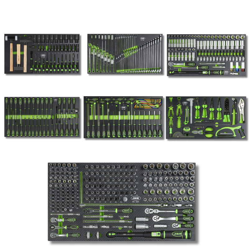 Ciężki, poszerzany wózek warsztatowy marki JBM, dostarczany z kompletnym wyposażeniem narzędziowym liczącym 468 elementów. Narzędzia zostały fabrycznie rozmieszczone w 7 dedykowanych modułach z trwałej pianki EVA, pokrytej odporną powłoką o strukturze włókna węglowego (Carbon). Konstrukcja wózka została zaprojektowana z myślą o maksymalnym obciążeniu rzędu 335 kg, co predysponuje go do intensywnej pracy w komercyjnych serwisach motoryzacyjnych.