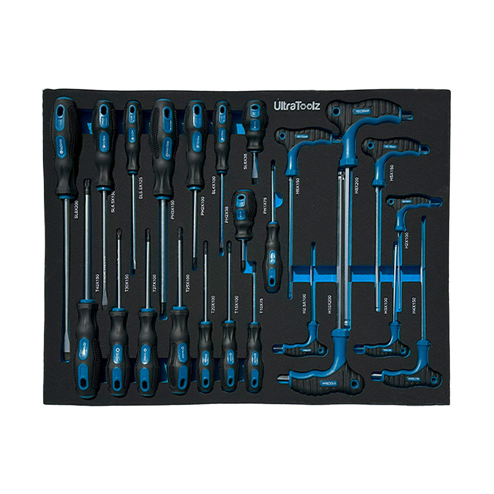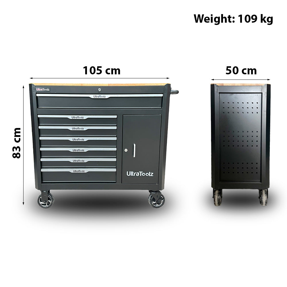 Profesjonalna szafka narzędziowa UltraToolz z siedmioma wypełnionymi szufladami, wyposażona w elektronarzędzia. Przemyślana organizacja oraz komfort użytkowania czynią ją niezbędnym rozwiązaniem dla warsztatów samochodowych, serwisów oraz profesjonalnych mechaników.