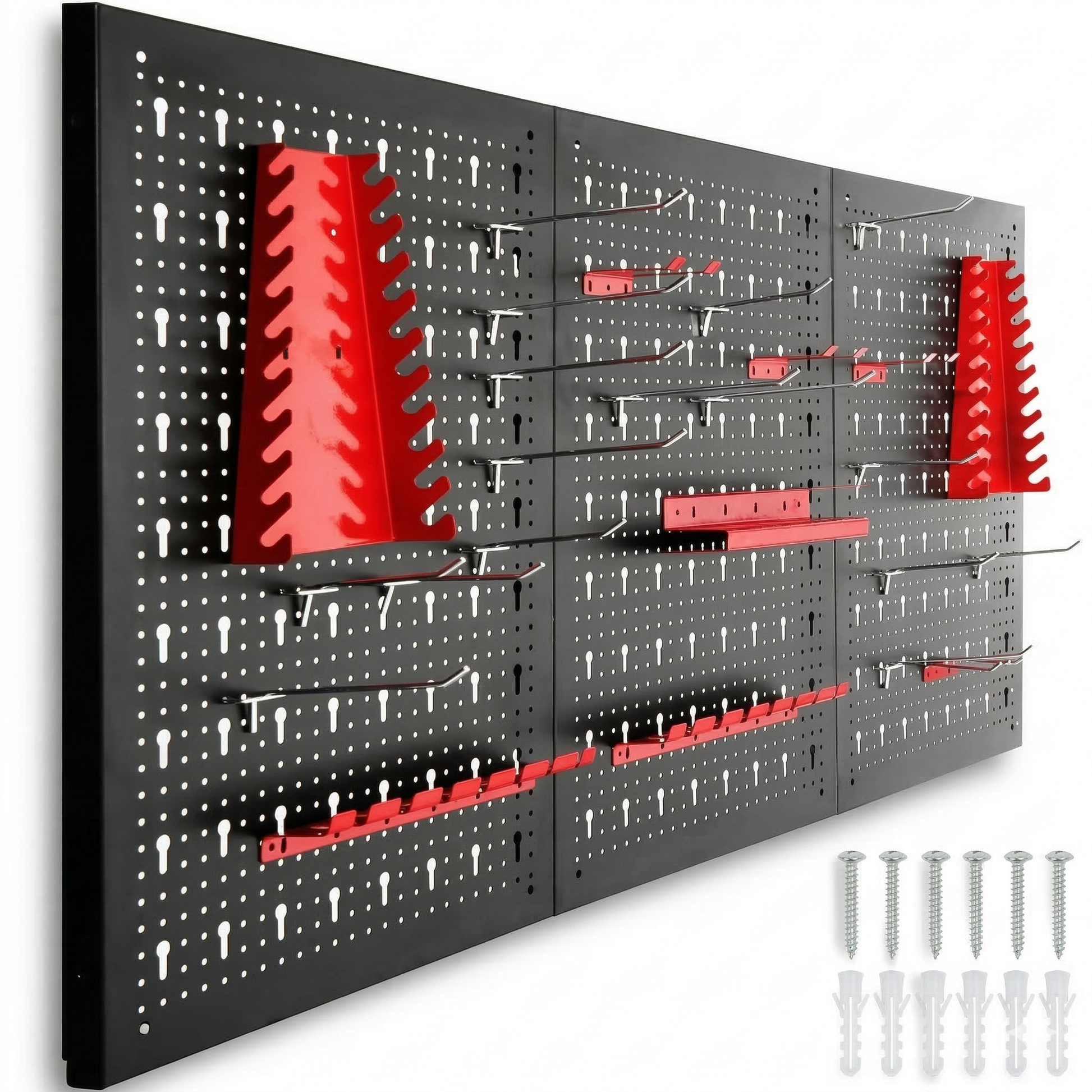 Dedykowany zestaw uchwytów: Komplet 25 akcesoriów mocujących pozwala na natychmiastowe zorganizowanie kluczy płasko-oczkowych, wkrętaków, szczypiec oraz innych narzędzi ręcznych.